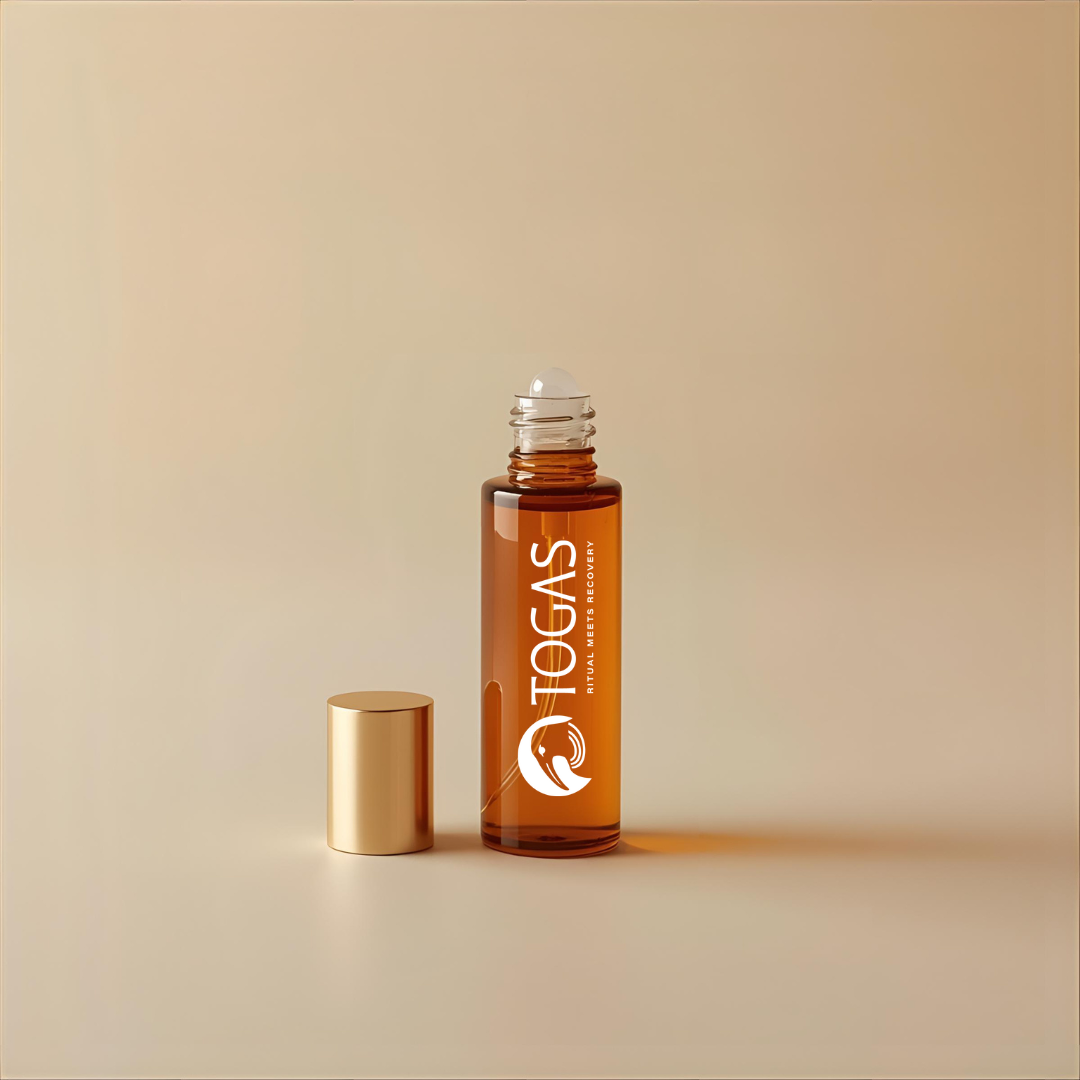 Healing oil in a glass roll-on applicator. Enhanced roll-on relief for active bodies. Experience disappearing pain, not numbed, not masked, just gone. Formulated with ancient healing traditions including wildcrafted sea moss (96 vitamins & minerals), magnesium glycinate for deep muscle relaxation, cayenne pepper to stimulate circulation, avocado for absorption, and sea salt. Whether you're lifting, healing, or moving, TOGAS meets you there.